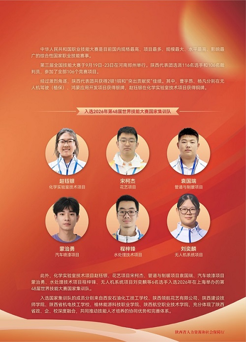 此外,化学实验室技术项目赵钰银、花艺项目宋柯杰、管道与制暖项目袁国瑞、汽车喷漆项目蒙治勇、水处理技术项目程梓锋、无人机系统项目刘奕麟等6名选手入选2026年在上海举办的第48届世界技能大赛国家集训队。