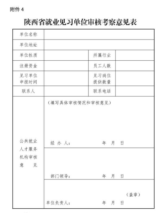 (二)审核考察。收到申报资料15个工作日内,公共就业人才服务机构完成资料审核,并对申报单位的见习场所、经营状况、管理水平、岗位需求等情况进行实地考察,填写陕西省就业见习单位审核考察意见表(附件4),报送同级人社部门。对审核考察不符合见习单位条件的.公共就业人才服务机,构应书面诵知申报单位;